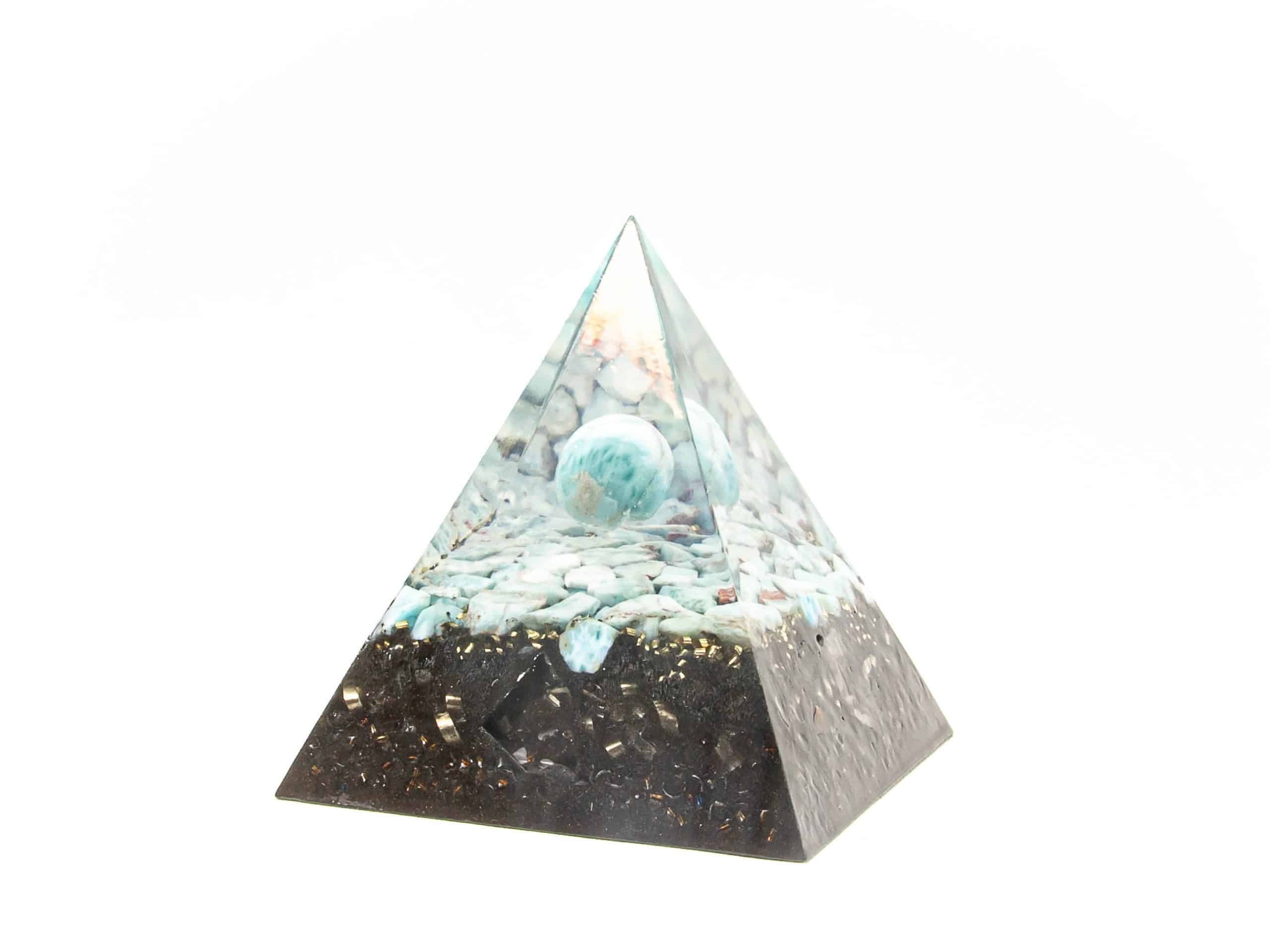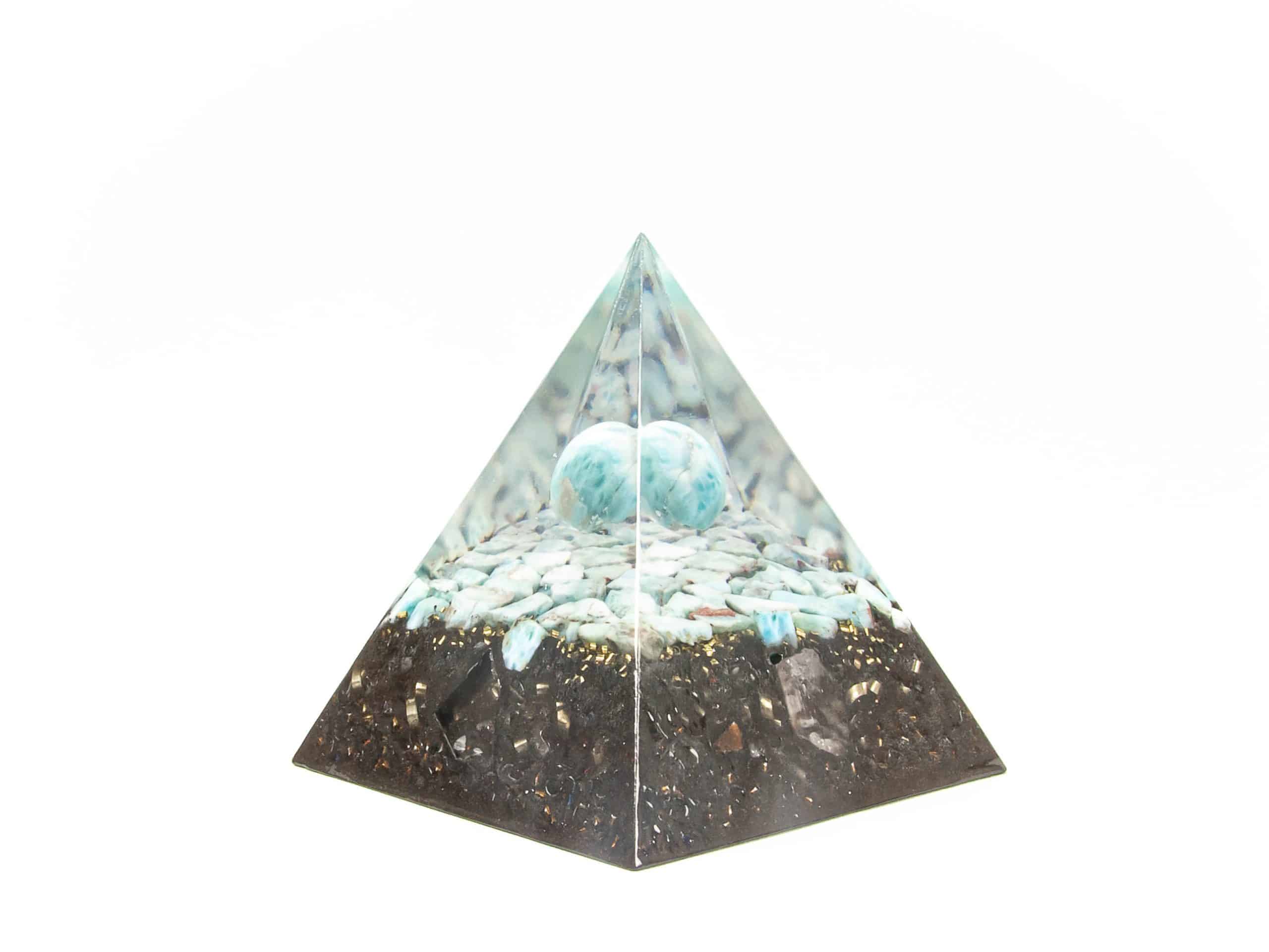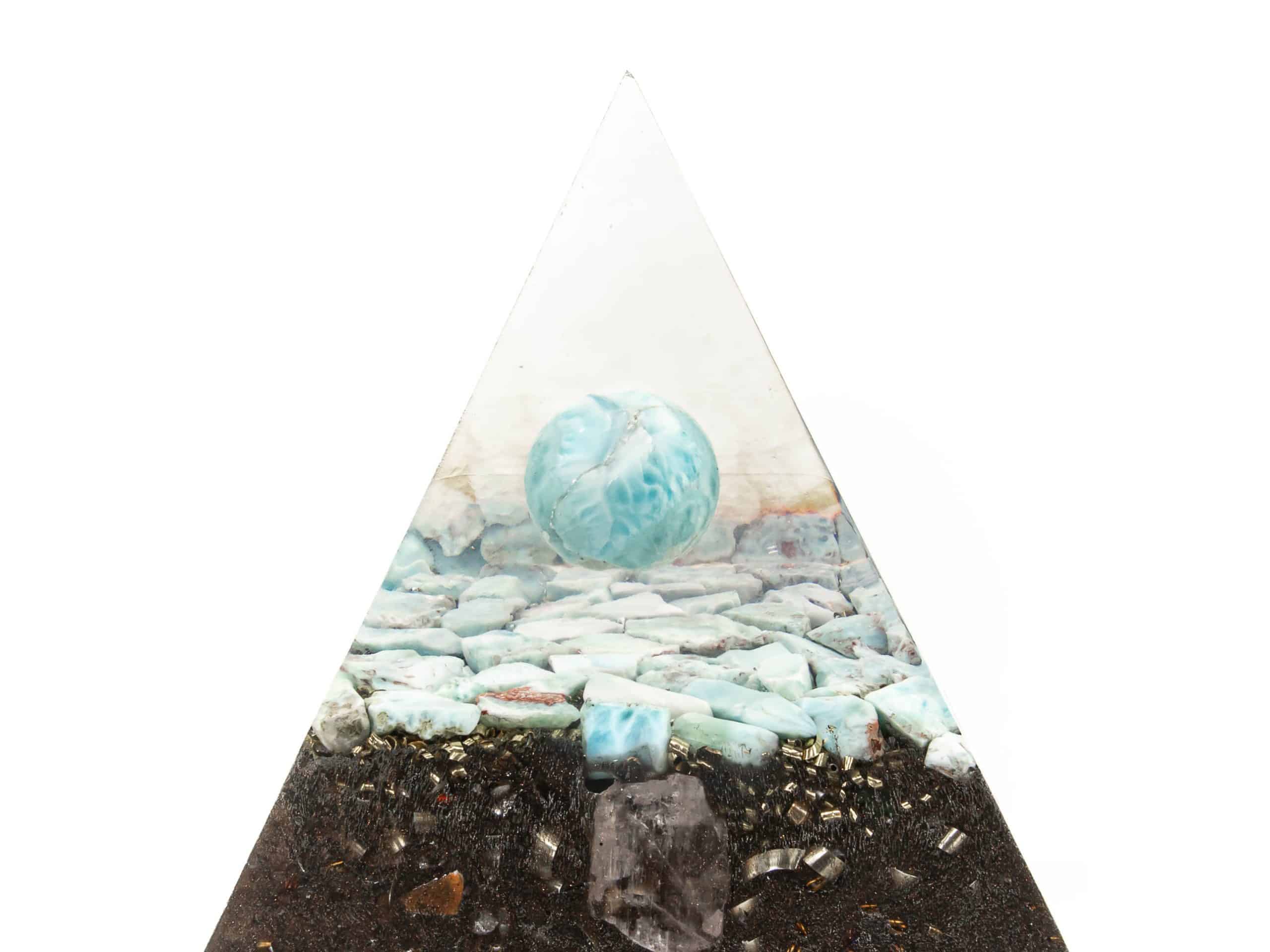 Larimar ist kein günstiger Stein, eine Kugel aus Larimar schon gar nicht. Ich habe es mir aber deswegen nicht nehmen lassen, Larimar Kugeln über einer Fläche aus Larimar schweben zu lassen. So entzückt das einmalige, karibische blau des Larimar auch in meinen Top-Pyramiden.